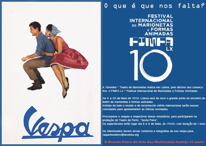 O Grande Palco da Arte das Marionetas festeja 10 anos! Queremos que o Vespa Clube de Lisboa faça parte desta festa FIMFA Lx10. |