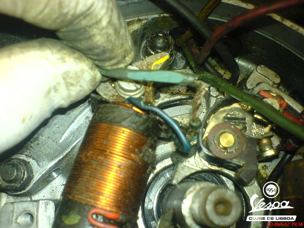 Cheio de óleo e com os fios partidos e outros descarnados. Fiz uma nova cablagem para o prato, coloquei o platinado novo e substituí uma das bobines: