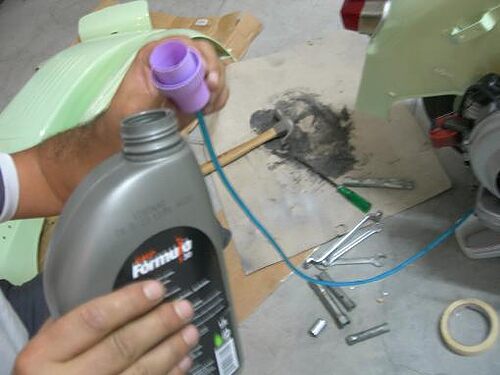 este é sistema homemade para colocar o oleo (uma tampa de "Flora Lava Tudo" furada e um tudo de plastico daqueles que protegia o cordel das pranchas de Bodyboard